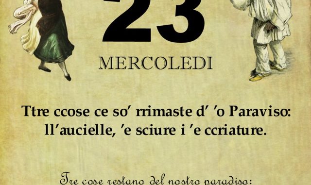 ‘O PRUVERBIO D’ ‘O JUORNO. Mercoledì 23 ottobre 2019 23/10/2019 binews.it ATTUALITA', EVIDENZA, Il Proverbio del Giorno 0 di Gianni Polverino Ttre ccose ce so’ rrimaste d’ ’o Paraviso: ll’aucielle, ’e sciure i ’e ccriature. Tre cose restano del nostro paradiso: gli uccelli, i fiori e i bambini.