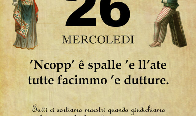 ‘O PRUVERBIO D’ ‘O JUORNO. Mercoledì 26 agosto 2020 26/08/2020 binews.it ATTUALITA', EVIDENZA, Il Proverbio del Giorno 0 di Gianni Polverino ’Ncopp’ ê spalle ’e ll’ate tutte facimmo ’e dutture. Tutti ci sentiamo maestri quando giudichiamo gli errori degli altri salvo a non riconoscere quelli che commettiamo noi.