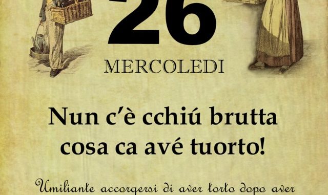 ‘O PRUVERBIO D’ ‘O JUORNO. Mercoledì 26 dicembre 2018 26/12/2018 binews.it ATTUALITA', EVIDENZA, Il Proverbio del Giorno 0 di Gianni Polverino Nun c’è cchiú brutta cosa ca avé tuorto! Umiliante accorgersi di aver torto dopo aver sostenuto con tutte le forze la propria ragione.