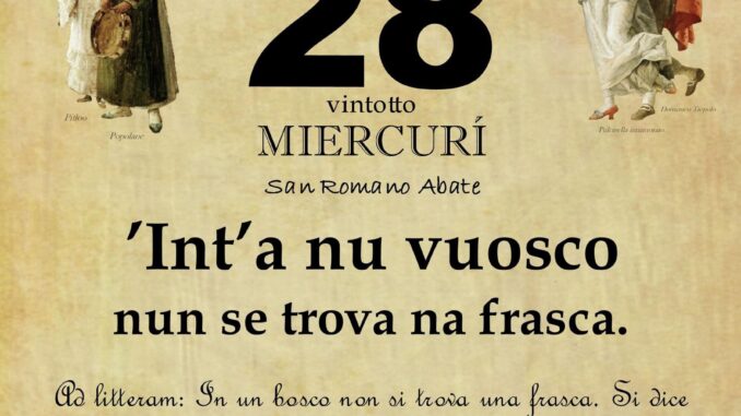 ‘O PRUVERBIO D’ ‘O JUORNO. Mercoledì 28 febbraio 2024 28/02/2024 binews.it ATTUALITA', EVIDENZA, Il Proverbio del Giorno 0 di Gianni Polverino ’Int’a nu vuosco nun se trova na frasca. Ad litteram: In un bosco non si trova una frasca. Si dice di una cosa che potrebbe apparire del tutto impossibile.