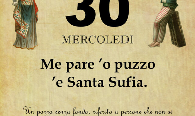 ‘O PRUVERBIO D’ ‘O JUORNO. Mercoledì 30 settembre 2020 30/09/2020 binews.it ATTUALITA', EVIDENZA, Il Proverbio del Giorno 0 di Gianni Polverino Me pare ’o puzzo ’e Santa Sufia. Un pozzo senza fondo, riferito a persone che non si accontentano mai.
