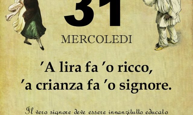 ‘O PRUVERBIO D’ ‘O JUORNO. Mercoledì 31 luglio 2019 31/07/2019 binews.it ATTUALITA', EVIDENZA, Il Proverbio del Giorno 0 di Gianni Polverino ’A lira fa ’o ricco, ’a crianza fa ’o signore. Il vero signore deve essere innanzitutto educato altrimenti sarà sempre e solo un semplice “arricchito”