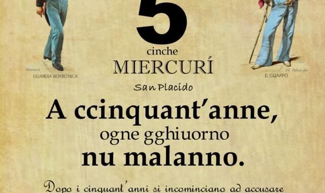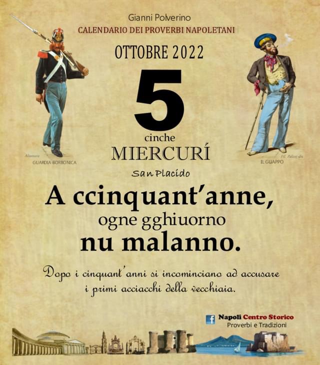 ‘O PRUVERBIO D’ ‘O JUORNO. Mercoledì 5 ottobre 2022 05/10/2022 binews.it ATTUALITA', EVIDENZA, Il Proverbio del Giorno 0 di Gianni PolverinoA ccinquant’anne, ogne gghiuorno nu malanno. Dopo i cinquant’anni si incominciano ad accusare i primi acciacchi della vecchiaia.