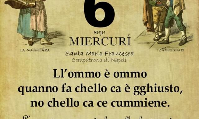 ‘O PRUVERBIO D’ ‘O JUORNO. Mercoledì 6 ottobre 2021 06/10/2021 binews.it ATTUALITA', EVIDENZA, Il Proverbio del Giorno 0 di Gianni Polverino Ll’ommo è ommo quanno fa chello ca è gghiusto, no chello ca ce cummiene. L’uomo è uomo quando fa quello che è giusto, non quello che gli conviene.