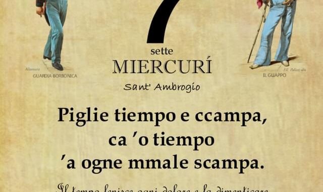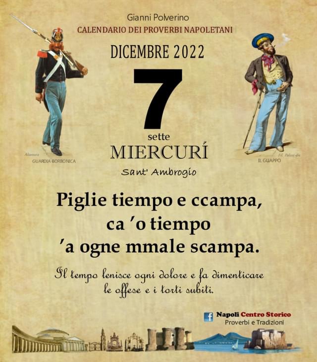 ‘O PRUVERBIO D’ ‘O JUORNO. Mercoledì 7 dicembre 2022 07/12/2022 binews.it ATTUALITA', EVIDENZA, Il Proverbio del Giorno 0 di Gianni PolverinoPiglie tiempo e ccampa, ca ’o tiempo ’a ogne mmale scampa. Il tempo lenisce ogni dolore e fa dimenticare le offese e i torti subiti.