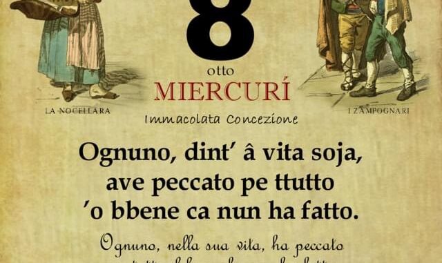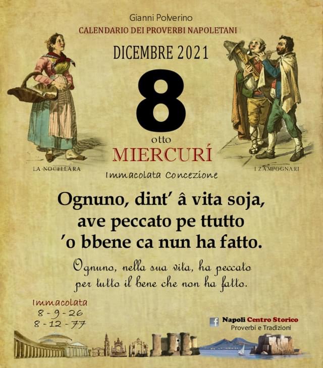 ‘O PRUVERBIO D’ ‘O JUORNO. Mercoledì 8 dicembre 2021 08/12/2021 binews.it ATTUALITA', EVIDENZA, Il Proverbio del Giorno 0 di Gianni PolverinoOgnuno, dint’ â vita soja, ave peccato pe ttutto ’o bbene ca nun ha fatto. Ognuno, nella sua vita, ha peccato per tutto il bene che non ha fatto.