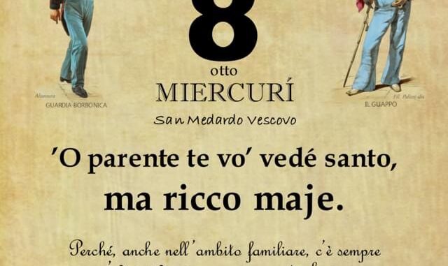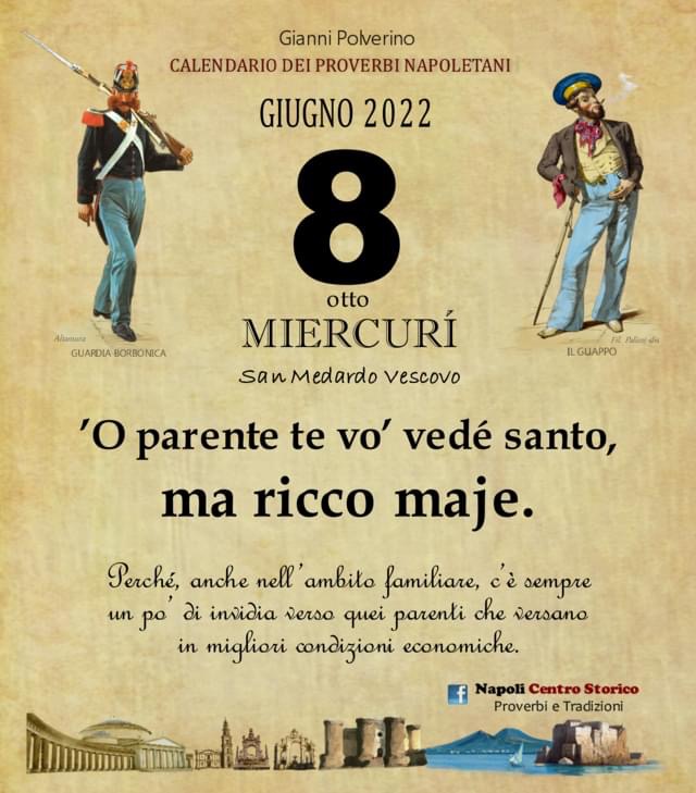 ‘O PRUVERBIO D’ ‘O JUORNO. Mercoledì 8 giugno 2022 08/06/2022 binews.it ATTUALITA', EVIDENZA, NOLANO 0 di Gianni Polverino ’O parente te vo’ vedé santo, ma ricco maje. Perché, anche nell’ambito familiare, c’è sempre un po’ di invidia verso quei parenti che versano in migliori condizioni economiche.