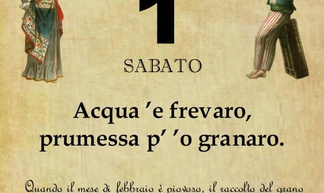 ‘O PRUVERBIO D’ ‘O JUORNO. Sabato 1 Febbraio 2020 01/02/2020 binews.it ATTUALITA', EVIDENZA, Il Proverbio del Giorno 0 di Gianni Polverino Acqua ’e frevaro, prumessa p’ ’o granaro. Quando il mese di febbraio è piovoso, il raccolto del grano di fine giugno sarà abbondante e di buona qualità.