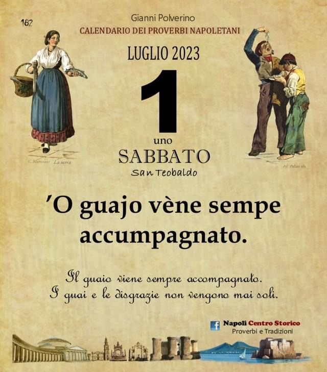 ‘O PRUVERBIO D’ ‘O JUORNO. Sabato 1 luglio 2023 01/07/2023 binews.it ATTUALITA', EVIDENZA, Il Proverbio del Giorno 0 di Gianni Polverino ’O guajo vène sempe accumpagnato. Il guaio viene sempre accompagnato. I guai e le disgrazie non vengono mai soli.