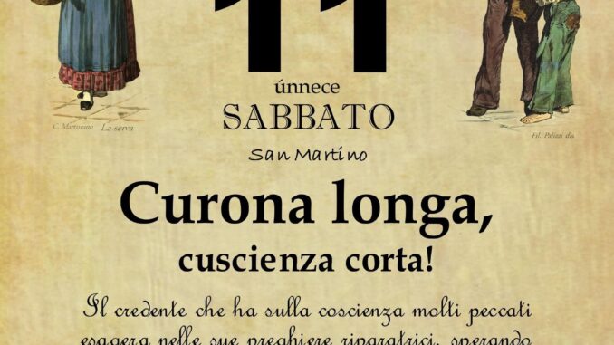 ‘O PRUVERBIO D’ ‘O JUORNO. Sabato 11 novembre 2023 11/11/2023 binews.it ATTUALITA', EVIDENZA, IRPINIA 0 di Gianni Polverino Curona longa, cuscienza corta! Il credente che ha sulla coscienza molti peccati esagera nelle sue preghiere riparatrici, sperando di ottenere così il perdono divino.