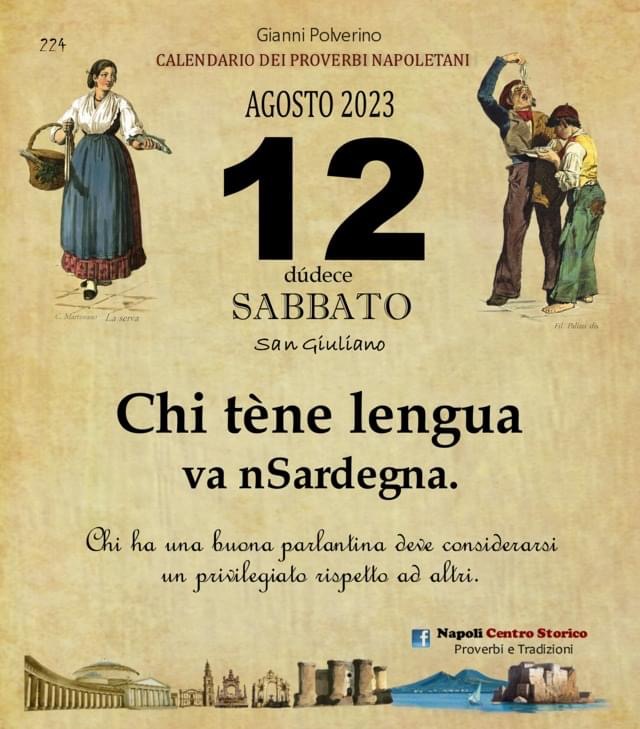 ‘O PRUVERBIO D’ ‘O JUORNO..Sabato 12 agosto 2025 12/08/2023 binews.it ATTUALITA', EVIDENZA, Il Proverbio del Giorno 0 di Gianni Polverino Chi tène lengua va nSardegna. Chi ha una buona parlantina deve considerarsi un privilegiato rispetto ad altri.