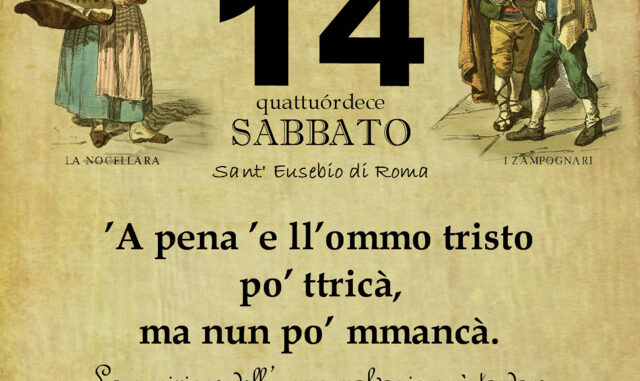 ‘O PRUVERBIO D’ ‘O JUORNO. Sabato 14 agosto 2021 14/08/2021 binews.it ATTUALITA', EVIDENZA, Il Proverbio del Giorno 0 di Gianni Polverino’A pena ’e ll’ommo tristo po’ ttricà, ma nun po’ mmancà.La punizione dell’uomo malvagio può tardare, ma di sicuro non mancherà.