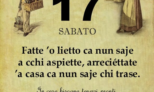 ‘O PRUVERBIO D’ ‘O JUORNO. Sabato 17 novembre 2018 17/11/2018 binews.it ATTUALITA', EVIDENZA, Il Proverbio del Giorno 0 di Gianni Polverino Fatte ’o lietto ca nun saje a cchi aspiette, arreciéttate ’a casa ca nun saje chi trase. In casa bisogna tenersi pronti, anche a visite inaspettate.