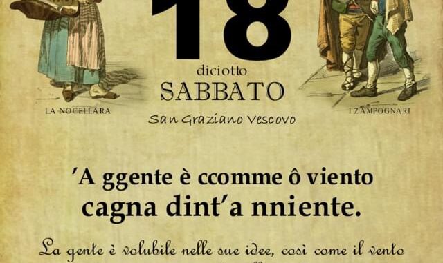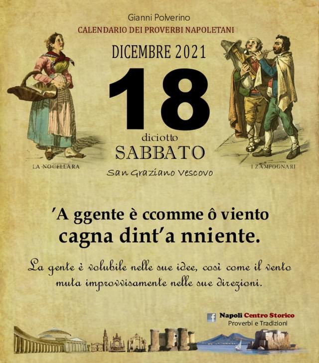 ‘O PRUVERBIO D’ ‘O JUORNO. Sabato 18 dicembre 2021 18/12/2021 binews.it ATTUALITA', EVIDENZA, Il Proverbio del Giorno 0 di Gianni Polverino ’A ggente è ccomme ô viento cagna dint’a nniente. La gente è volubile nelle sue idee, così come il vento muta improvvisamente nelle sue direzioni.
