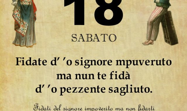 ‘O PRUVERBIO D’ ‘O JUORNO. Sabato 18 Gennaio 2020 18/01/2020 binews.it ATTUALITA', EVIDENZA, Il Proverbio del Giorno 0 [responsivevoice_button voice=”Italian Female” buttontext=”Ascolta l’articolo”]di Gianni Polverino Fidate d’ ’o signore mpuveruto ma nun te fidà d’ ’o pezzente sagliuto. Fidati del signore impoverito ma non fidarti del povero arricchito.