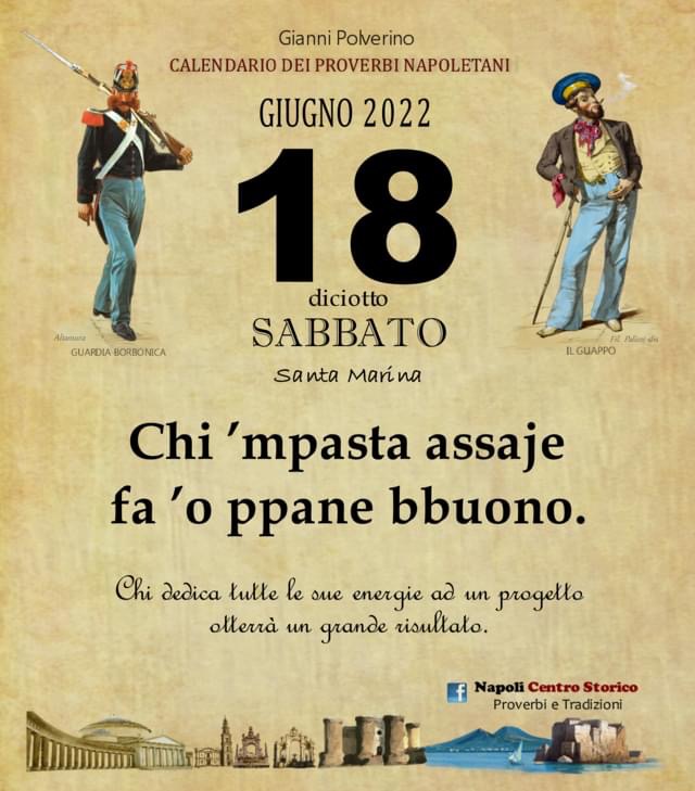 ‘O PRUVERBIO D’ ‘O JUORNO. Sabato 18 giugno 2022 18/06/2022 binews.it ATTUALITA', EVIDENZA, Il Proverbio del Giorno 0 di Gianni Polverino Chi ’mpasta assaje fa ’o ppane bbuono. Chi dedica tutte le sue energie ad un progetto otterrà un grande risultato.