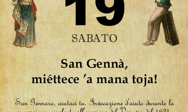 ‘O PRUVERBIO D’ ‘O JUORNO. Sabato 19 settembre 2020 19/09/2020 binews.it ATTUALITA', EVIDENZA, Il Proverbio del Giorno 0 di Gianni Polverino San Gennà, miéttece ’a mana toja! San Gennaro, aiutaci tu. Invocazione d’aiuto durante la processione risalente all’eruzione del Vesuvio del 1631, e per miracolo la lava si fermò alle porte della città.