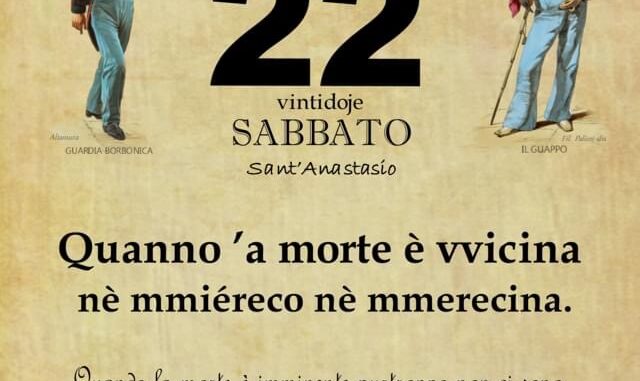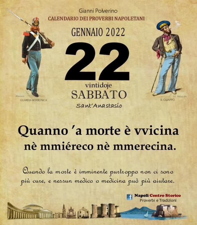‘O PRUVERBIO D’ ‘O JUORNO. Sabato 22 gennaio 2022 22/01/2022 binews.it ATTUALITA', EVIDENZA, Il Proverbio del Giorno 0 di Gianni PolverinoQuanno ’a morte è vvicina nè mmiéreco nè mmerecina. Quando la morte è imminente purtroppo non ci sono più cure, e nessun medico o medicina può più aiutare.