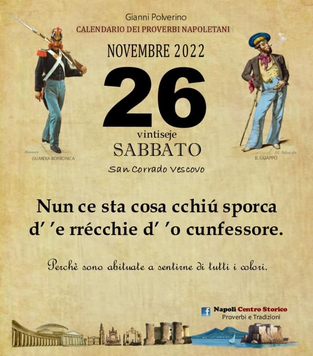 ‘O PRUVERBIO D’ ‘O JUORNO. Sabato 27 novembre 2022 26/11/2022 binews.it ATTUALITA', EVIDENZA, Il Proverbio del Giorno 0 di Gianni PolverinoNun ce sta cosa cchiú sporca d’ ’e rrécchie d’ ’o cunfessore. Perchè sono abituate a sentirne di tutti i colori.