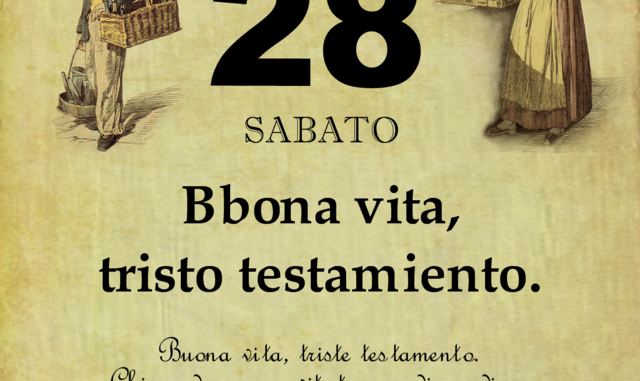 ‘O PRUVERBIO D’ ‘O JUORNO. Sabato 28 aprile 2018 28/04/2018 binews.it ATTUALITA', Il Proverbio del Giorno 0 di Gianni Polverino Bbona vita, tristo testamiento. Buona vita, triste testamento. Chi conduce una vita troppo dispendiosa lascerà ben poco agli eredi.