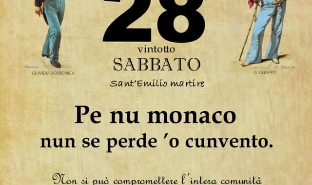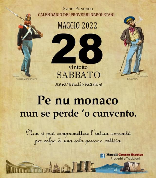 ‘O PRUVERBIO D’ ‘O JUORNO. Sabato 28 maggio 2022 28/05/2022 binews.it ATTUALITA', EVIDENZA, Il Proverbio del Giorno 0 di Gianni Polverino Pe nu monaco nun se perde ’o cunvento. Non si può compromettere l’intera comunità per colpa di una sola persona cattiva.