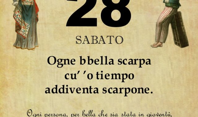 ‘O PRUVERBIO D’ ‘O JUORNO. Sabato 28 marzo 2020 28/03/2020 binews.it ATTUALITA', EVIDENZA, Il Proverbio del Giorno 0 di Gianni Polverino Ogne bbella scarpa cu’ ’o tiempo addiventa scarpone. Ogni persona, per bella che sia stata in gioventù, con l’andare degli anni diventa brutta e rugosa.
