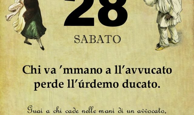 ‘O PRUVERBIO D’ ‘O JUORNO. Sabato 28 settembre 2019 28/09/2019 binews.it ATTUALITA', EVIDENZA, Il Proverbio del Giorno 0 di Gianni Polverino Chi va ’mmano a ll’avvucato perde ll’úrdemo ducato. Guai a chi cade nelle mani di un avvocato, specie se è disonesto o di pochi scrupoli.