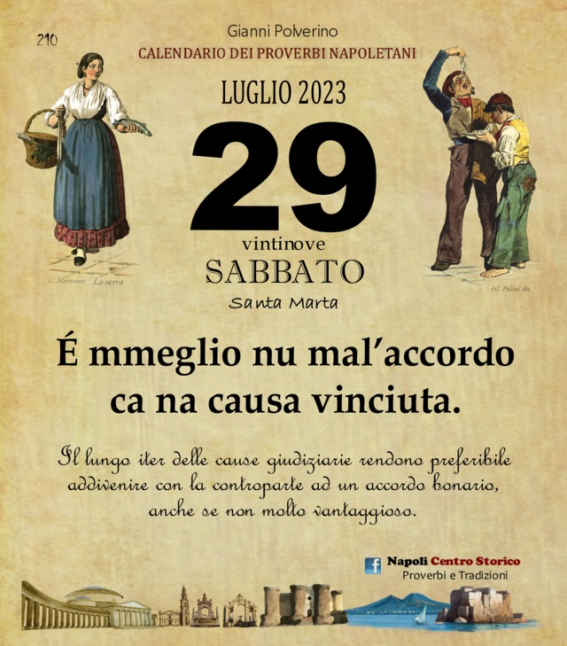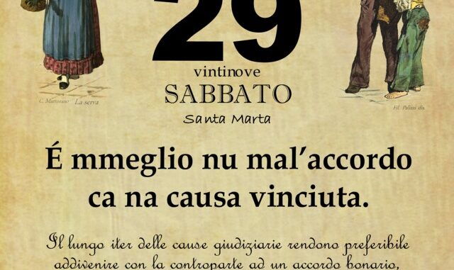 ‘O PRUVERBIO D’ ‘O JUORNO. Sabato 29 luglio 2023 29/07/2023 binews.it ATTUALITA', EVIDENZA, Il Proverbio del Giorno 0 di Gianni Polverino É mmeglio nu mal’accordo ca na causa vinciuta. Il lungo iter delle cause giudiziarie rendono preferibile addivenire con la controparte ad un accordo bonario, anche se non molto vantaggioso.