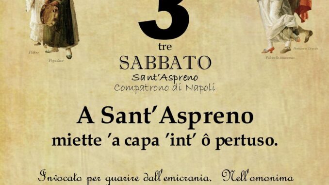 ‘O PRUVERBIO D’ ‘O JUORNO. Sabato 3 agosto 2024 03/08/2024 binews.it Almanacco, ATTUALITA', EVIDENZA 0 di Gianni Polverino A Sant’Aspreno miette ’a capa ’int’ ô pertuso. Invocato per guarire dall’emicrania. Nell’omonima chiesa, sull’altare, vi era un foro dove i fedeli, per guarire, introducevano la testa.