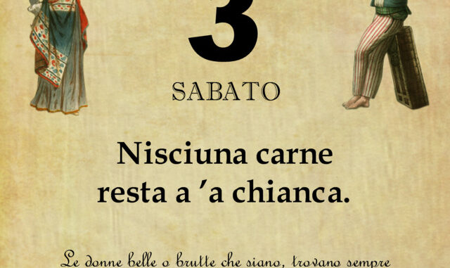 ‘O PRUVERBIO D’ ‘O JUORNO. Sabato 3 ottobre 2020 03/10/2020 binews.it ATTUALITA', EVIDENZA, Il Proverbio del Giorno 0 di Gianni Polverino Nisciuna carne resta a ’a chianca. Le donne belle o brutte che siano, trovano sempre un’adeguata sistemazione.