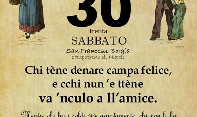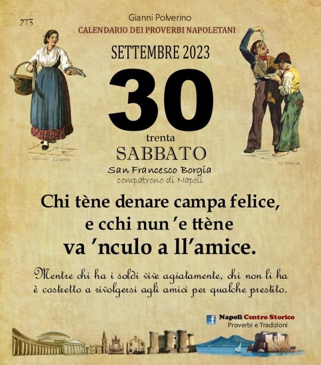 ‘O PRUVERBIO D’ ‘O JUORNO. Sabato 30 settembre 2023 30/09/2023 binews.it ATTUALITA', EVIDENZA, Il Proverbio del Giorno 0 di Gianni PolverinoChi tène denare campa felice, e cchi nun ’e ttène va ’nculo a ll’amice. Mentre chi ha i soldi vive agiatamente, chi non li ha è costretto a rivolgersi agli amici per qualche prestito.