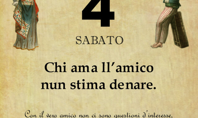 ‘O PRUVERBIO D’ ‘O JUORNO. Sabato 4 luglio 2020 04/07/2020 binews.it ATTUALITA', EVIDENZA, Il Proverbio del Giorno 0 di Gianni Polverino Chi ama ll’amico nun stima denare. Con il vero amico non ci sono questioni d’interesse, anzi, più delle volte, ci si rimette anche.