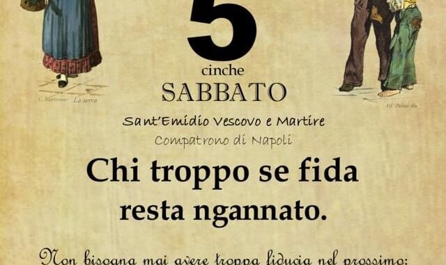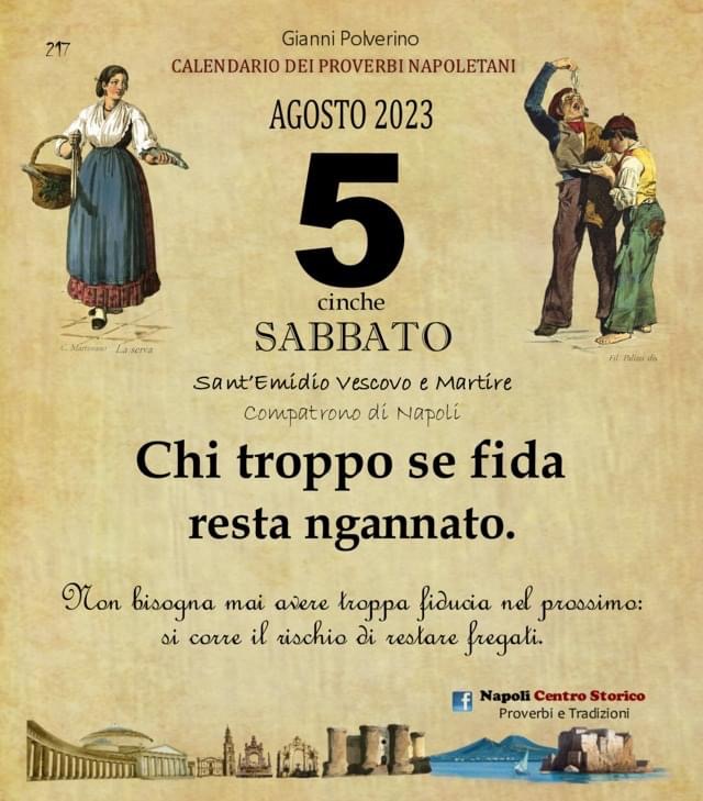 ‘O PRUVERBIO D’ ‘O JUORNO. Sabato 5 agosto 2023 05/08/2023 binews.it ATTUALITA', EVIDENZA, Il Proverbio del Giorno 0 di Gianni Polverino Chi troppo se fida resta ngannato. Non bisogna mai avere troppa fiducia nel prossimo: si corre il rischio di restare fregati.