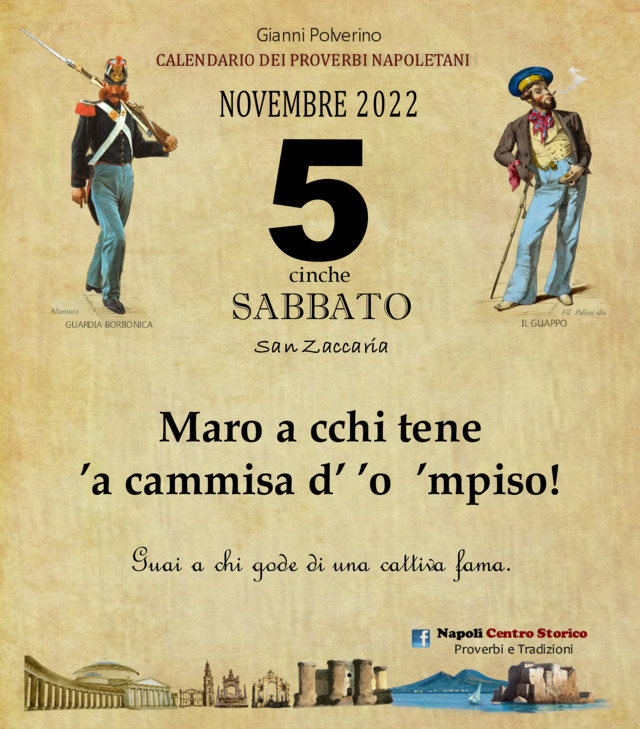 ‘O PRUVERBIO D’ ‘O JUORNO. Sabato 5 novembre 2022 05/11/2022 binews.it ATTUALITA', EVIDENZA, Il Proverbio del Giorno 0 di Gianni Polverino Maro a cchi tene ’a cammisa d’ ’o ’mpiso! Guai a chi gode di una cattiva fama.