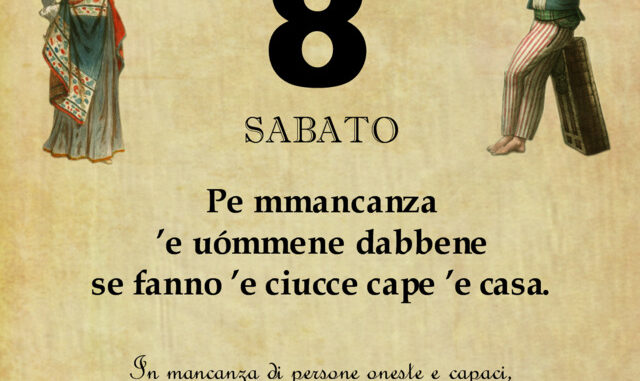 ‘O PRUVERBIO D’ ‘O JUORNO. Sabato 8 agosto 2020 08/08/2020 binews.it ATTUALITA', EVIDENZA, Il Proverbio del Giorno 0 di Gianni Polverino Pe mmancanza ’e uómmene dabbene se fanno ’e ciucce cape ’e casa. In mancanza di persone oneste e capaci, i disonesti salgono al potere.