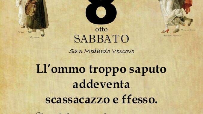O PRUVERBIO D’ ‘O JUORNO. Sabato 8 giugno 2024 08/06/2024 binews.it ATTUALITA', EVIDENZA, Il Proverbio del Giorno 0 di Gianni Polverino Ll’ommo troppo saputo addeventa scassacazzo e ffesso. Chi vuole fare troppo il saputo può diventare antipatico e noioso.