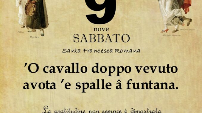 ‘O PRUVERBIO D’ ‘O JUORNO. Sabato 9 marzo 2024 09/03/2024 binews.it ATTUALITA', EVIDENZA, Il Proverbio del Giorno 0 di Gianni Polverino ’O cavallo doppo vevuto avota ’e spalle â funtana. La gratitudine non sempre è dimostrata a riguardo di chi fa del bene.