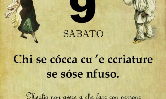 ‘O PRUVERBIO D’ ‘O JUORNO. Sabato 9 novembre 2019 09/11/2019 binews.it ATTUALITA', EVIDENZA, Il Proverbio del Giorno 0 di Gianni Polverino Chi se cócca cu ’e ccriature se sóse nfuso. Meglio non avere a che fare con persone di educazione e coltura diverse.