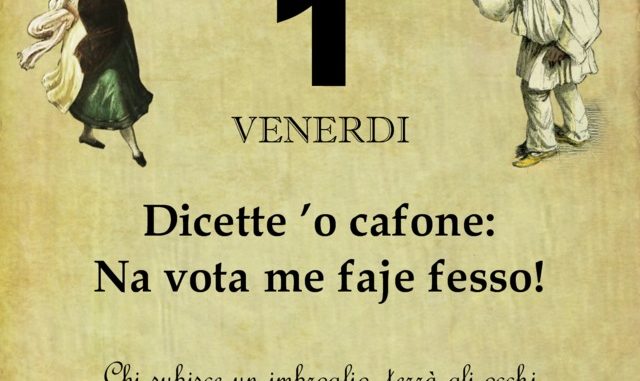 ‘O PRUVERBIO D’ ‘O JUORNO. Venerdì 1 novembre 2019 01/11/2019 binews.it ATTUALITA', EVIDENZA, Il Proverbio del Giorno 0 di Gianni Polverino Dicette ’o cafone: Na vota me faje fesso! Chi subisce un imbroglio, terrà gli occhi bene aperti per non ricaderci.