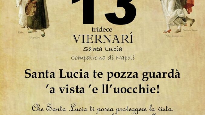 ‘O PRUVERBIO D’ ‘O JUORNO. Venerdì 13 dicembre 2024 13/12/2024 binews.it ATTUALITA', EVIDENZA, Il Proverbio del Giorno 0 di Gianni Polverino Santa Lucia te pozza guardà ’a vista ’e ll’uocchie! Che Santa Lucia ti possa proteggere la vista. Considerata per tradizione, la patrona della vista e di tutti coloro che ne soffrono.