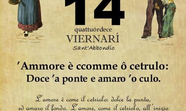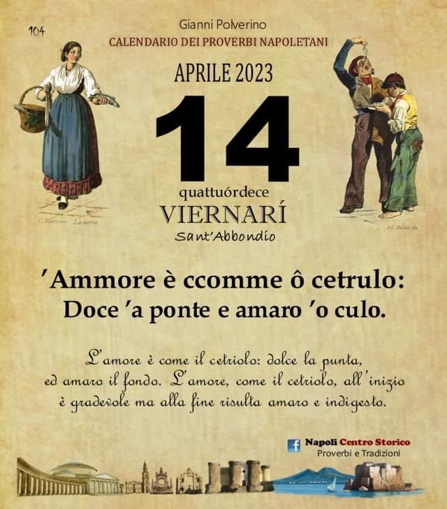 ‘O PRUVERBIO D’ ‘O JUORNO. Venerdì 14 aprile 2023 14/04/2023 binews.it ATTUALITA', EVIDENZA, Il Proverbio del Giorno 0 di Gianni Polverino ’Ammore è ccomme ô cetrulo: Doce ’a ponte e amaro ’o culo. L’amore è come il cetriolo: dolce la punta, ed amaro il fondo. L’amore, come il cetriolo, all’inizio è gradevole ma alla fine risulta amaro e indigesto.