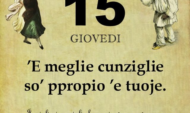 ‘O PRUVERBIO D’ ‘O JUORNO. Venerdì 15 agosto 2019 15/08/2019 binews.it ATTUALITA', EVIDENZA, Il Proverbio del Giorno 0 di Gianni Polverino ’E meglie cunziglie so’ ppropio ’e tuoje. I migliori consigli che puoi avere provengono proprio da te stesso, dalla tua coscienza.