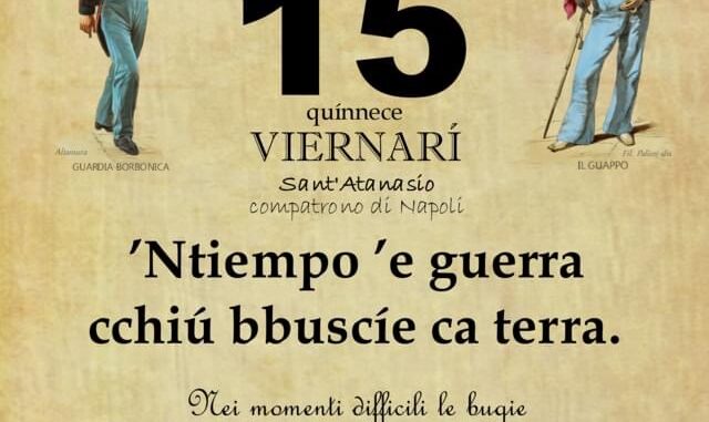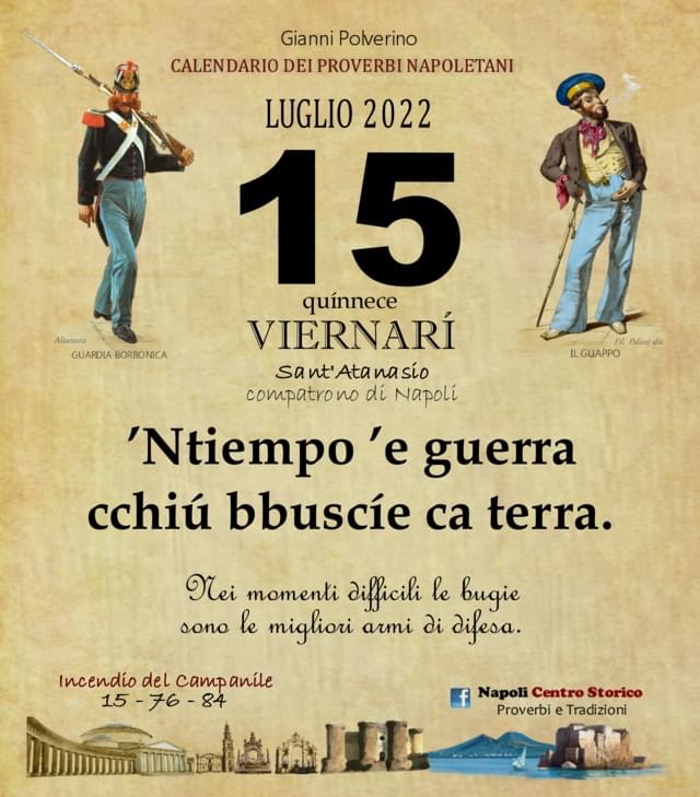 ‘O PRUVERBIO D’ ‘O JUORNO. Venerdì 15 luglio 2022 15/07/2022 binews.it ATTUALITA', EVIDENZA, Il Proverbio del Giorno 0 di Gianni Polverino ’Ntiempo ’e guerra cchiú bbuscíe ca terra. Nei momenti difficili le bugie sono le migliori armi di difesa.