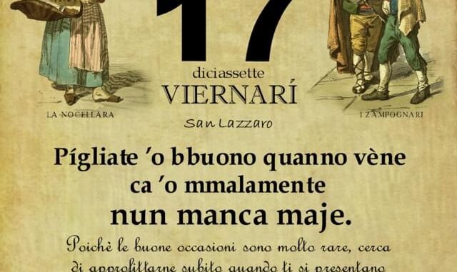 ‘O PRUVERBIO D’ ‘O JUORNO. Venerdì 17 dicembre 2021 17/12/2021 binews.it ATTUALITA', EVIDENZA, Il Proverbio del Giorno 0 di Gianni PolverinoPígliate ’o bbuono quanno vène ca ‘o mmalamente nun manca maje. Poichè le buone occasioni sono molto rare, cerca di approfittarne subito quando ti si presentano perchè di cose cattive ve ne saranno sempre inabbondanza.