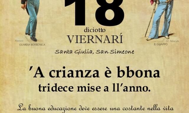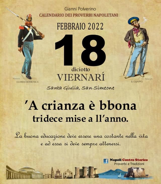 O PRUVERBIO D’ ‘O JUORNO. Venerdì 18 febbraio 2022 18/02/2022 binews.it ATTUALITA', EVIDENZA, Il Proverbio del Giorno 0 di Gianni Polverino ’A crianza è bbona tridece mise a ll’anno. La buona educazione deve essere una costante nella vita e ad essa si deve sempre attenersi.