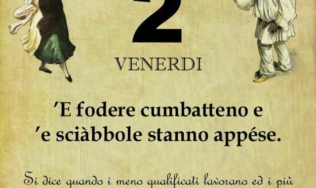 ‘O PRUVERBIO D’ ‘O JUORNO. Venerdì 2 agosto 2019 02/08/2019 binews.it ATTUALITA', EVIDENZA, Il Proverbio del Giorno 0 di Gianni Polverino ’E fodere cumbatteno e ’e ssciàbbole stanno appése. Si dice quando i meno qualificati lavorano ed i più capaci restano in ozio e sfruttano l’opera dei primi