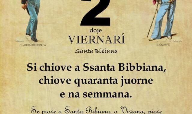 ‘O PRUVERBIO D’ ‘O JUORNO. Venerdì 2 dicembre 2022 02/12/2022 binews.it ATTUALITA', EVIDENZA, Il Proverbio del Giorno 0 di Gianni PolverinoSi chiove a Ssanta Bibbiana, chiove quaranta juorne e na semmana. Se piove a Santa Bibiana, o Viviana, piove quaranta giorni e una settimana.