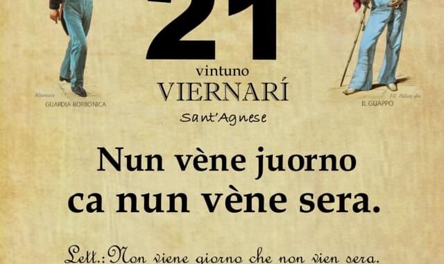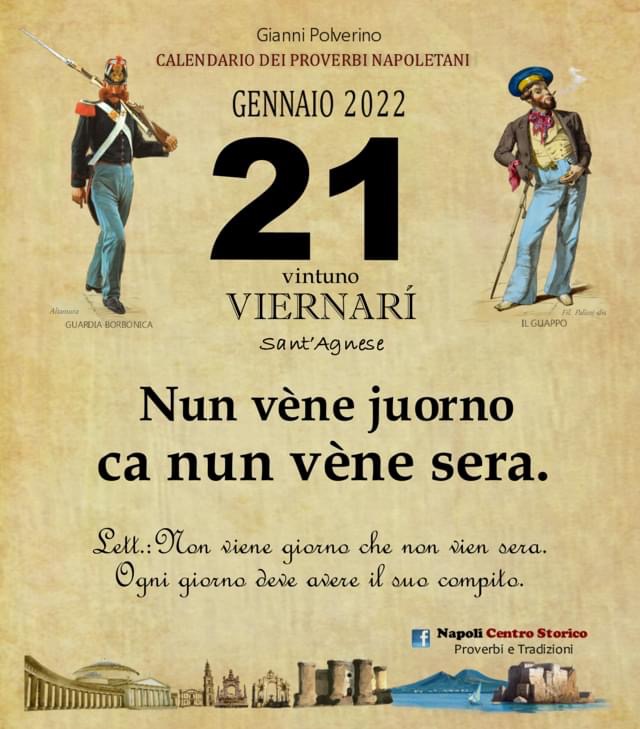 ‘O PRUVERBIO D’ ‘O JUORNO. Venerdì 21 gennaio 2022 21/01/2022 binews.it ATTUALITA', EVIDENZA, Il Proverbio del Giorno 0 di Gianni PolverinoNun vène juorno ca nun vène sera. Non viene giorno che non vien sera. Ogni giorno deve avere il suo compito.