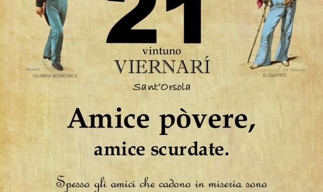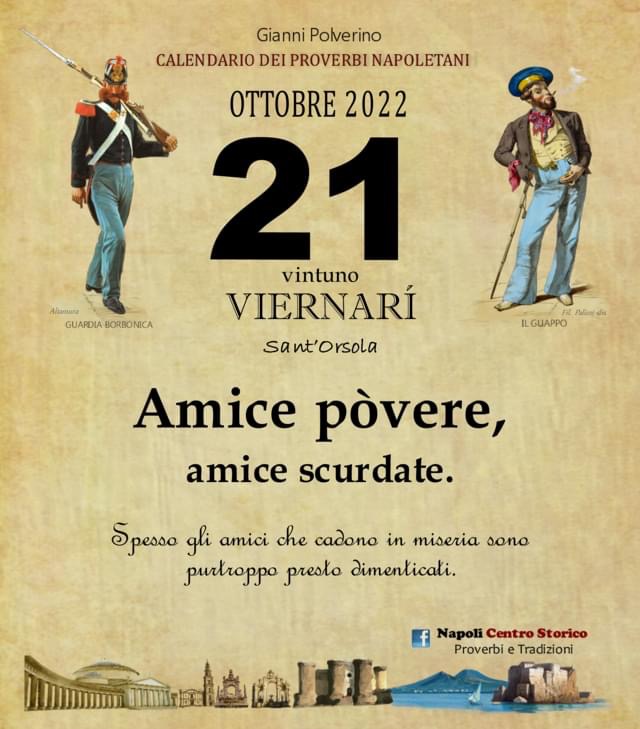 ‘O PRUVERBIO D’ ‘O JUORNO. Venerdì 21 ottobre 2022 21/10/2022 binews.it ATTUALITA', EVIDENZA, Il Proverbio del Giorno 0 di Gianni PolverinoAmice pòvere, amice scurdate. Spesso gli amici che cadono in miseria sono purtroppo presto dimenticati.