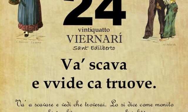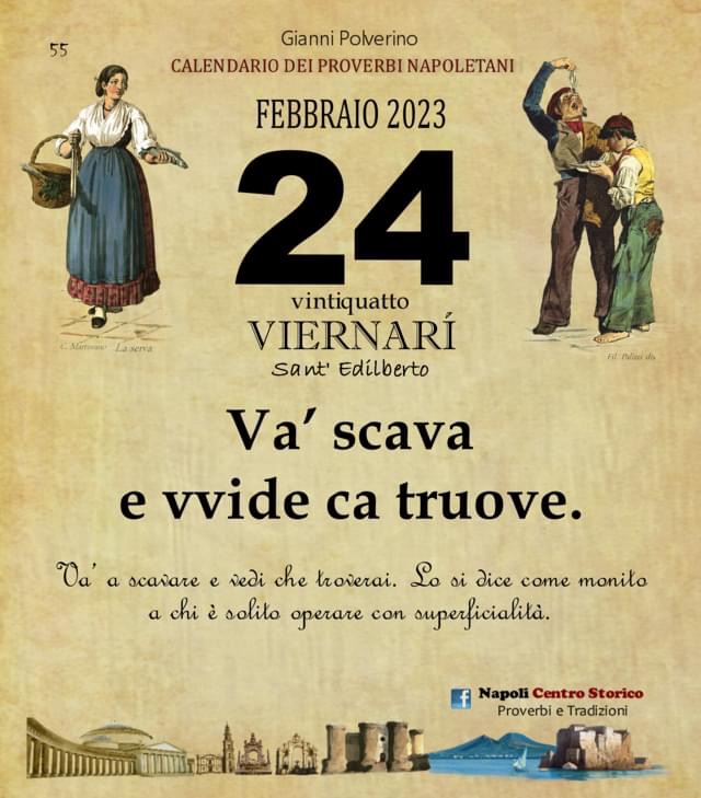 ‘O PRUVERBIO D’ ‘O JUORNO. Venerdì 24 febbraio 2023 24/02/2023 binews.it ATTUALITA', EVIDENZA, Il Proverbio del Giorno 0 di Gianni Polverino Va’ scava e vvide ca truove. Va’ a scavare e vedi che troverai. Lo si dice come monito a chi è solito operare con superficialità.